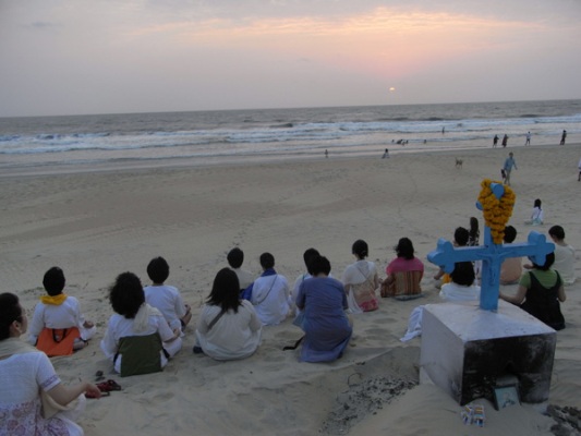 アラビア海に沈む夕陽のなか、皆さんで揃って瞑想をした。